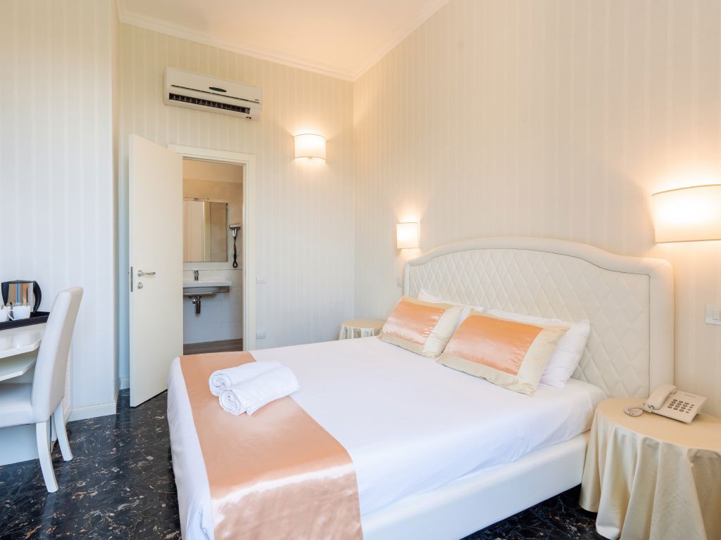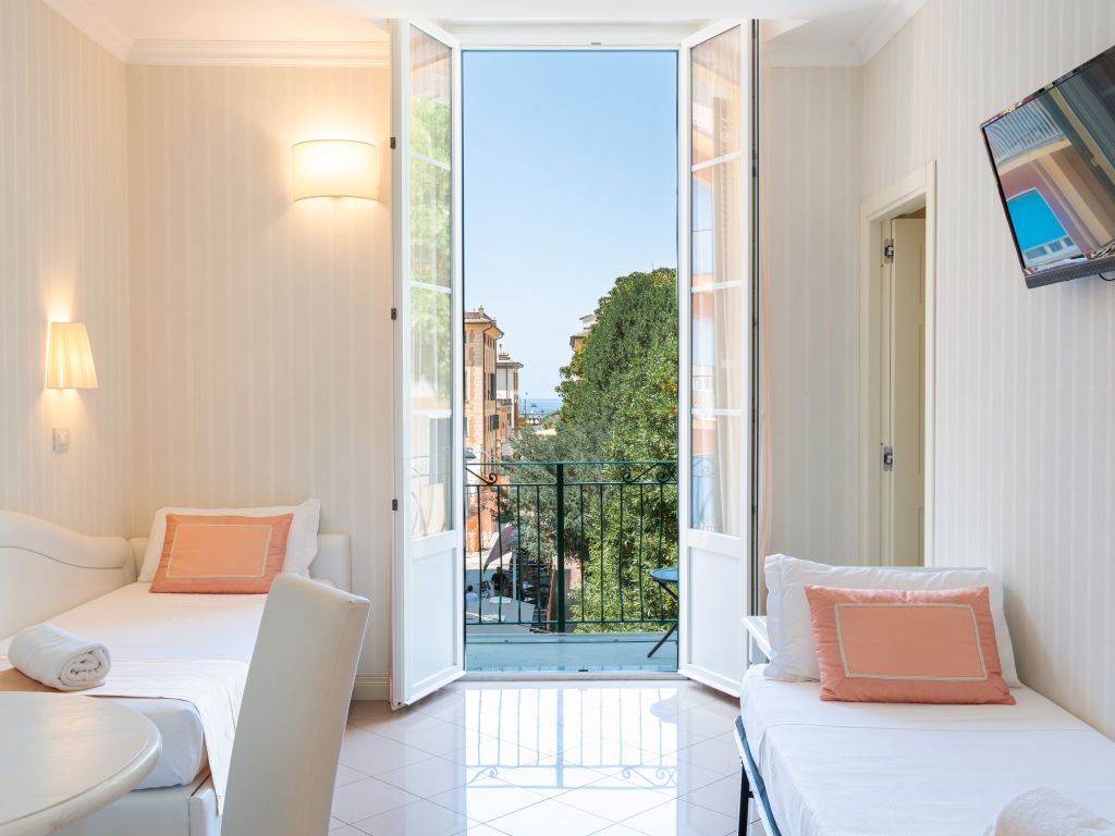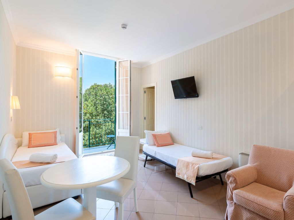 Es befindet sich im zweiten Stock des Hotels und besteht aus zwei miteinander verbundenen Zimmern, einem Badezimmer und einem Balkon, von dem aus Sie das Meer in 200 Metern Entfernung sehen können.