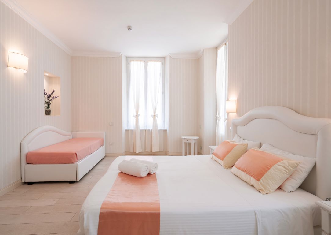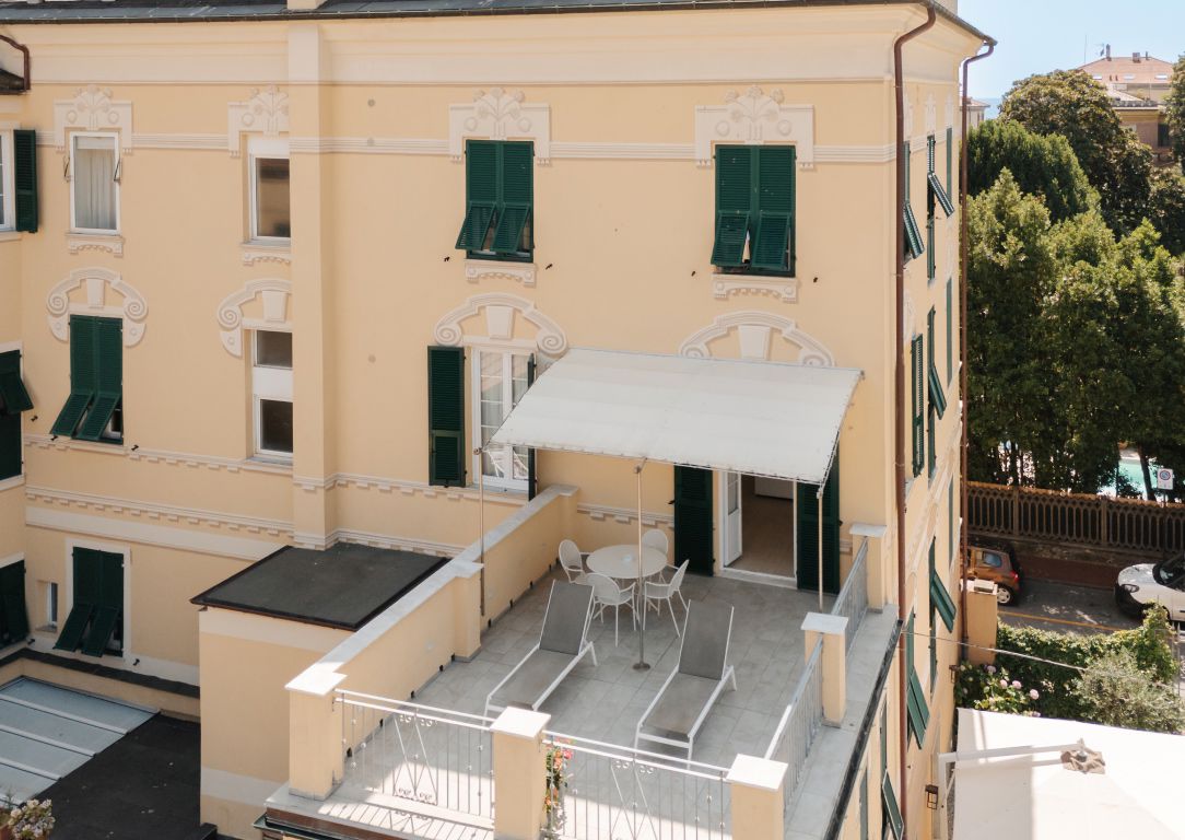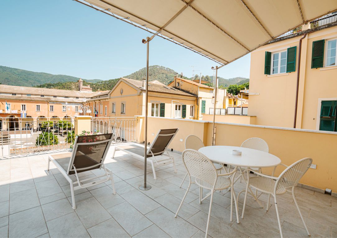 A 30 m² room, spacious and luminous, which can accommodate up to 4 people.The private terrace has an awning, a table and chairs and 2 sun loungers. It has the view over the town square and the wonderful hills surrounding Levanto.